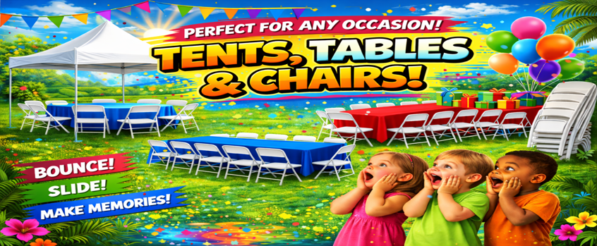 Need more than inflatables? Browse our tent, table, and chair rentals in Huntsville to complete your event setup and make guest seating, food areas, and shade simple.